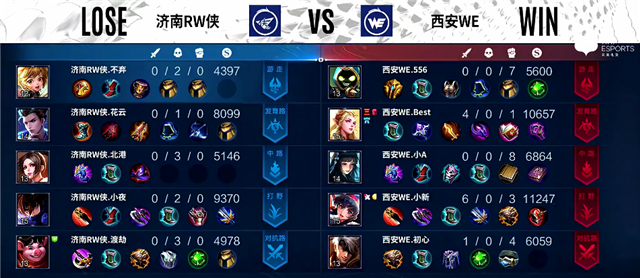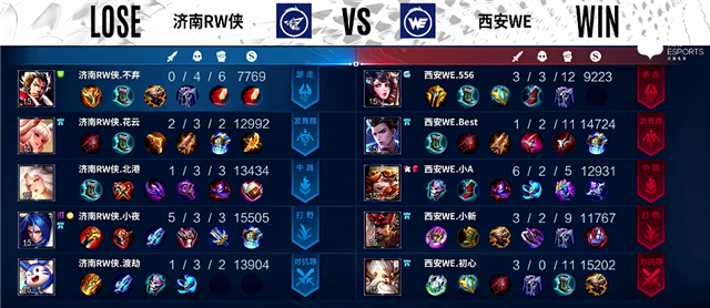 双方和平开局。2分28秒镜拿下主宰,兰陵王拿下暴君。3分40秒上路交火,兰陵王拿下一血。5分10秒上路团战,双方1换1。5分40秒镜推掉上路一塔。6分20秒虞姬推掉上路一塔。7分24秒兰陵王拿下主宰。10分10秒马可波罗被击杀,虞姬推掉下路二塔。10分40秒兰陵王拿下暴君。12分钟马可波罗被击杀。13分50秒兰陵王被击杀。14分20秒中路团战,西安WE打出0换2,镜推掉中路一塔。15分钟镜拿下暴君。16分40秒中路团战,廉颇被击杀。17分10秒西安WE推掉上路高地塔,团战打出0换2。18分40秒野区团战,济南RW侠打出2换3。20分12秒镜拿下风暴龙王,团战西安E打出1换3。21分23秒西安WE推掉水晶拿下本场比赛胜利。