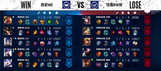 双方和平开局。1分56秒娜可露露击杀不知火舞拿下一血。2分27秒娜可露露拿下暴君。3分10秒中路团战,猪八戒被击杀。3分20秒不知火舞被击杀。5分30中路团战,猪八戒被击杀。5分45秒艾琳推掉下路一塔。7分10秒娜可露露拿下暴君。8分50秒艾琳推掉中路一塔。10分20秒澜拿下主宰,艾琳拿下暴君。12分30秒上路团战,西安WE团灭济南RW侠,艾琳拿下三杀。13分01秒西安WE推掉水晶率先拿下一分。