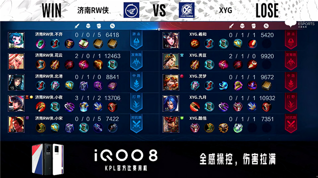 3分16秒,XYG控下暴君,随后济南RW侠控下先知主宰。4分44秒,双方团,XYG打出0换2。7分10秒,XYG击杀李元芳。7分30秒,济南RW侠拿下暴君,随后XYG拿下先知主宰。9分01秒,XYG嬴政破掉济南RW侠中一塔。9分30秒,XYG击杀裴擒虎。9分50秒,XYG破掉济南RW侠上二塔。10分40秒,XYG控下暗影暴君,随后济南RW侠控下暗影主宰。11分钟,双方团,XYG打出0换4。11分24秒,XYG破掉济南RW侠下高地及中二塔。11分50秒,双方团战1换1。12分45秒,XYG击杀裴擒虎。13分22秒,XYG破掉济南RW侠中高地。15分10秒,XYG团战打出1换3,公孙离拿下三杀。15分35秒,XYG团灭对手摧毁济南RW侠水晶拿到赛点。