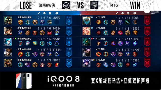 双方常规开局。1分07秒济南RW侠拿下中路河道之灵。1分18秒野区团战MTG击杀关羽拿到一血。1分30秒MTG中路击杀太乙真人。1分40秒济南RW侠中路击杀兰陵王。2分21秒暴君处团战MTG打出0换3。4分03秒济南RW侠主宰处打出1换2。4分25秒济南RW侠拿下主宰。5分31秒MTG野区击杀赵云。5分49秒主宰处团战MTG打出0换2。6分41秒中路团战双方1换1。8分42秒MTG拿下主宰。9分17秒野区团战双方2换2。10分41秒MTG拿下暗影暴君。12分04中路团战济南RW侠打出1换2。MTG摧毁敌方中路外、二塔。13分34秒MTG拿下暗影主宰。15分13秒MTG拿下暗影暴君。16分56秒济南RW侠打出2换3。18分10秒主宰处团战MTG打出1换5。18分42秒MTG摧毁敌方水晶拿下比赛。