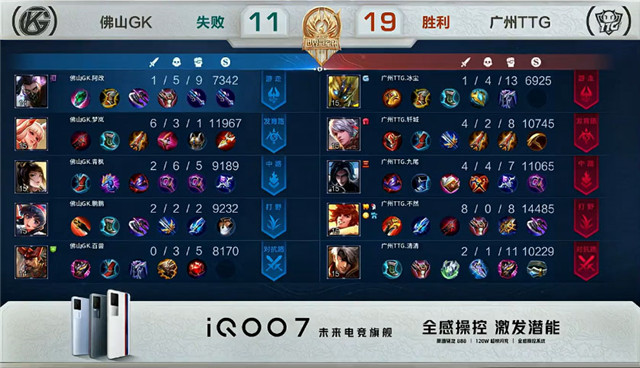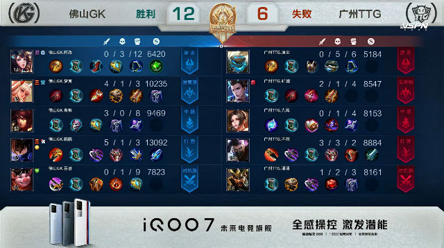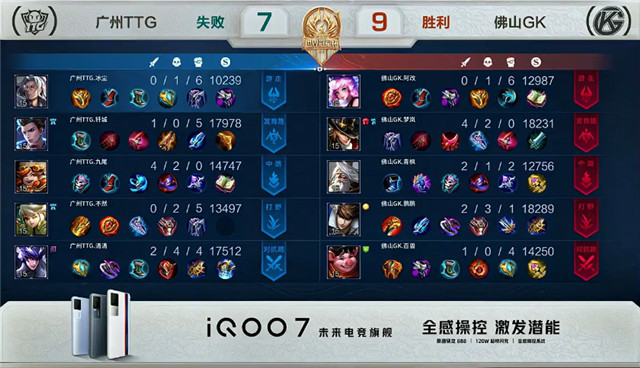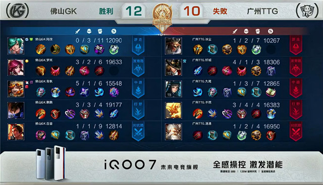 双方常规开局。1分08秒广州TTG拿下中路河道之灵。1分20秒佛山GK反掉敌方蓝BUFF。1分51秒佛山GK对抗路击杀东皇太一拿到一血。3分13秒佛山GK野区击杀露娜。3分59秒发育路团战佛山GK打出0换4。5分52秒佛山GK发育路击杀东皇太一。7分09秒双方中路1换1。7分25秒佛山GK拿下主宰。8分43秒佛山GK野区击杀东皇太一。8分58秒佛山GK摧毁敌方中路高地塔。9分23秒佛山GK拿下暴君。10分13秒广州TTG摧毁敌方对抗路二塔。10分27秒对抗路团战佛山GK打出1换3。10分59秒佛山GK拿下暗影主宰。11分54秒佛山GK发育路击杀东皇太一。12分04秒佛山GK摧毁敌方发育路高地塔。12分41秒佛山GK拿下暗影暴君。13分12秒对抗路团战佛山GK打出0换5。13分41秒佛山GK摧毁敌方水晶拿下比赛。