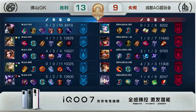 54秒裴擒虎击杀项羽拿下一血。2分26秒裴擒虎拿下暴君。2分50秒下路团战,佛山GK打出0换3。4分16秒成都AG超玩会下路一塔被破。4分35秒裴擒虎拿下主宰。5分钟上路团战,佛山GK打出0换3,关羽拿下双杀,佛山GK推掉中路一塔。6分20秒裴擒虎推掉上路二塔。6分50秒裴擒虎拿下暴君。7分30秒佛山GK强攻下路高地塔,团战佛山GK打出1换3。7分43秒裴擒虎拿下主宰。10分15秒裴擒虎拿下暴君。10分42秒裴擒虎拿下主宰。12分钟佛山GK强攻上路高地塔,佛山GK打出1换2。14分33秒裴擒虎拿下暴君。15分07秒裴擒虎拿下主宰。16分03秒裴擒虎推掉中路高地塔。17分23秒佛山GK强攻水晶,团战团灭成都AG超玩会,裴擒虎拿下五杀,佛山GK推掉水晶追平比分。