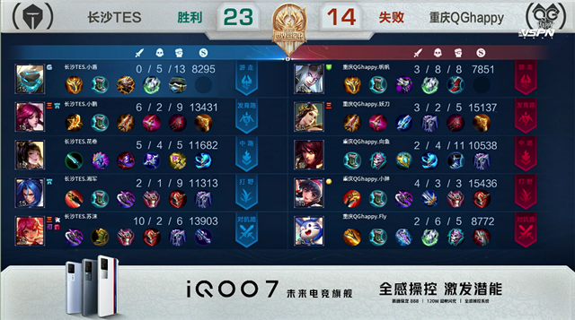 1分53秒,长沙TES花木兰上路击杀梦奇拿下一血。3分16秒,长沙TES拿下暴君。3分56秒,重庆QG强推掉长沙TES中一塔,长沙TES反打打出1换2。6分23秒,中路团,重庆QG打出1换2。7分43秒,长沙TES中路击杀虞姬。9分58秒,双方团,长沙TES打出1换3。10分33秒,长沙TES拿下暗影暴君。11分17秒,长沙TES上官婉儿击杀东皇太一。12分24秒,长沙TES拿下暗影主宰。13分42秒,长沙TES接连破掉重庆QG下、上二塔。14分11秒,长沙TES破掉重庆QG上高地,随后重庆QG击杀盾山。14分52秒,重庆QG拿下暗影暴君。15分18秒,双方团,长沙TES打出,2换3,伽罗拿下三杀。16分40秒,重庆QG拿下暗影主宰,随后团战双方4换4,虞姬拿下三杀。17分28秒,重庆QG虞姬接连破掉长沙TES中二塔及高地。18分35秒,中路团,长沙TES打出2换5团灭对手,花木兰拿下三杀。19分24秒,长沙TES破掉重庆QG水晶赢下比赛。