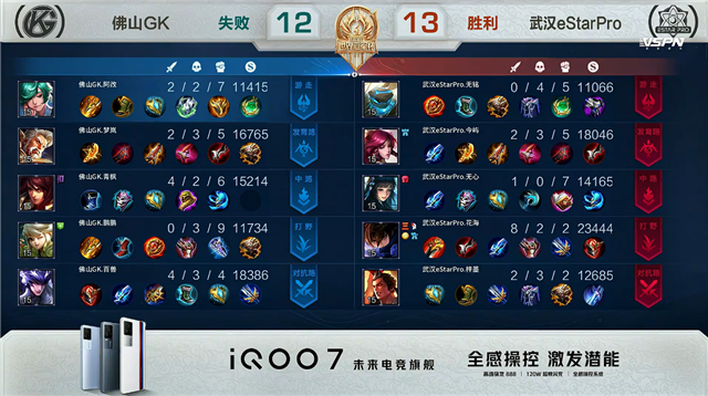 开局武汉ES蒙犽中路抢线。1分整佛山GK反掉敌方蓝BUFF。2分04秒对抗路团战武汉ES打出0换3。3分55秒双方中路1换1。4分46秒武汉ES拿下暴君。6分37秒野区团战佛山GK打出1换2。7分20秒野区团战佛山GK打出1换5。9分17秒佛山GK拿下暴君。9分46秒佛山GK野区击杀孙膑。10分18秒佛山GK暴君处击杀张良。11分34秒佛山GK摧毁敌方对抗路二塔。11分53秒佛山GK拿下暗影主宰。12分11秒佛山GK野区打出1换5。12分40秒佛山GK摧毁敌方水晶拿下比赛。