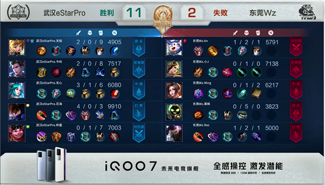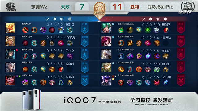 开局东莞Wz拿下4个buff。2分01秒,东莞Wz盘古上路越塔击杀马超拿下一血。2分17秒,武汉ES拿下暴君。2分38秒,双方团,武汉ES马超拿下三杀。4分06秒,上路团战双方1换1。4分55秒,武汉ES接连破掉东莞Wz下路两座外塔。5分30秒,东莞Wz下路追击打出0换3。6分47秒,暴君团,武汉ES打出1换2。8分58秒,武汉ES破掉东莞Wz中一塔。11分25秒,武汉ES击杀盘古后控下暗影暴君。11分49秒,武汉ES破掉东莞Wz中二塔及中、下两座高地。13分04秒,武汉ES拿下暗影主宰。13分28秒,武汉ES破掉东莞Wz上高地。14分01秒,双方团,武汉ES打出1换4团灭对手。14分16秒,武汉ES一波摧毁东莞Wz水晶赢下比赛。