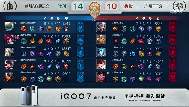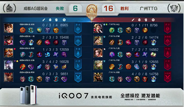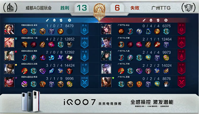 双方和平开局。2分20秒橘右京拿下暴君。4分钟野区团战,橘右京拿下一血。4分38秒百里守约推掉中路一塔。4分50秒百里守约推掉下路一塔。5分20秒橘右京拿下主宰。7分钟马超在上路被单杀。7分50秒橘右京拿下暴君。8分44秒橘右京推掉下路二塔。9分35秒貂蝉被击杀。10分50秒橘右京拿下暴君。11分50秒成都AG超玩会强攻上路高地塔,吕布被击杀。13分38秒成都AG超玩会再次强攻上路高地塔,吕布被击杀。14分10秒成都AG超玩会强推中路高地塔,团战团灭广州TTG。14分47秒成都AG超玩会推掉水晶率先拿下赛点。