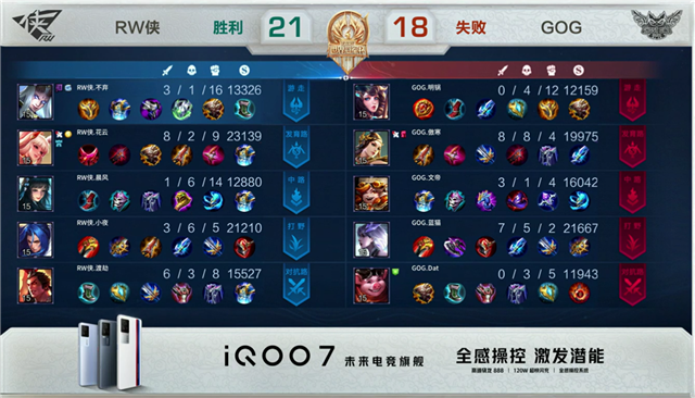 1分47秒,RW侠露娜抓上击杀关羽拿下一血。2分18秒,RW侠控下先知主宰,GOG拿下暴君。4分43秒,RW侠中路击杀不知火舞,随后破掉GOG中一塔。6分22秒,RW侠百里守约击杀公孙离。6分40秒,双方团战1换1,随后RW侠破掉GOG下二塔。8分45秒,RW侠破掉GOG上二塔,随后击杀关羽。10分08秒,RW侠击杀张飞。10分27秒,RW侠露娜控下暗影暴君,正面RW侠击杀公孙离,随后破掉GOG中高地。11分16秒,RW侠破掉GOG下高地。12分07秒,RW侠破掉GOG上高地。12分52秒,RW侠接连击杀敌方3人后,破掉GOG水晶赢下比赛!
