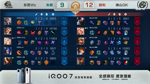 双方常规开局。2分14秒佛山GK拿下主宰。2分55秒东莞Wz野区击杀猪八戒拿到一血。3分30秒上路团战佛山GK打出0换3。4分22秒佛山GK拿下暴君。5分38秒佛山GK下路猪八戒单杀镜。5分42秒佛山GK上路击杀孙膑。6分13秒佛山GK中路击杀吕布。7分50秒佛山GK高地下击杀扁鹊。8分07秒佛山GK摧毁敌方下路高地塔。8分27秒佛山GK摧毁敌方中路高地塔。9分05秒佛山GK拿下暴君。9分38秒高地团战佛山GK打出0换3。9分53秒佛山GK摧毁敌方水晶拿下比赛。