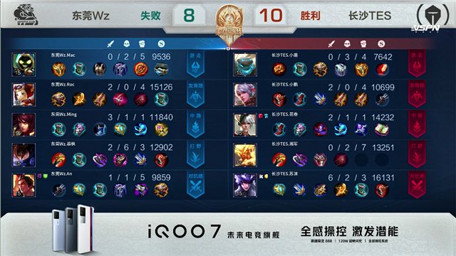 1分02秒,长沙TES夏侯惇上路单杀马可波罗拿下一血。2分15秒,长沙TES拿下暴君。4分20秒,东莞Wz沈梦溪击杀蔡文姬。4分40秒,东莞Wz下路击杀不知火舞。6分06秒,东莞Wz沈梦溪中路单杀不知火舞。7分44秒,中路团,长沙TES打出0换2。8分01秒,长沙TES破掉东莞Wz上一塔。11分08秒,长沙TES拿下暗影暴君,随后团战打出0换2并破掉东莞Wz下二塔。12分05秒,长沙TES破掉东莞Wz中二塔,随后控下暗影主宰。14分47秒,长沙TES破掉东莞Wz上高地。15分29秒,长沙TES不知火舞上路蹲杀娜可露露。15分56秒,长沙TES破掉东莞Wz中、下两座高地。16分18秒,长沙TES一波摧毁东莞Wz水晶赢下比赛。