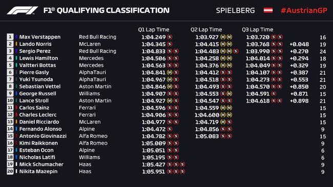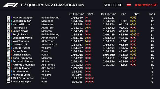 2021F1奥地利大奖赛排位赛Q2最终成绩: