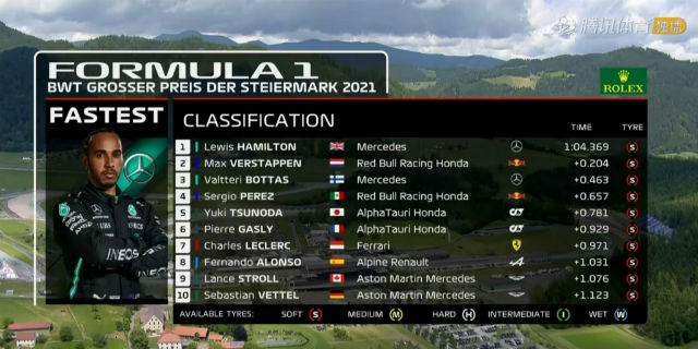 直播车讯 北京时间6月26日晚,2021F1施蒂利亚大奖赛第三次自由练习赛在红牛环赛道结束。经过一个小时的比拼,梅奔车手汉密尔顿以1分04秒369排名第一,维斯塔潘落后0.204秒排名第二,博塔斯第三,佩雷兹排名第四,梅赛德斯和红牛车队包揽前四名。P5-P10分别为:角田裕毅、加斯利、勒克莱尔、阿隆索、斯特罗尔和维特尔。排位赛将在北京时间今晚21:00开始。