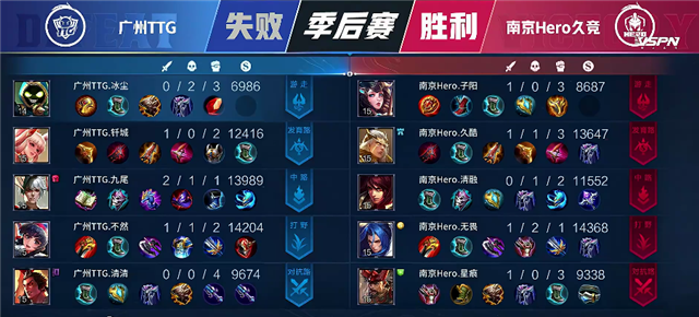 双方和平开局。2分31秒橘右京拿下暴君。3分40秒娜可露露拿下主宰。4分35秒南京Hero久竞推掉中路一塔。6分10秒广州TTG下路一塔被破。6分45秒下河道团战,嬴政拿下一血。7分09秒吕布拿下暴君。8分22秒橘右京拿下主宰。8分45秒上路团战,娜可露露被击杀。10分19秒橘右京拿下主宰。10分35秒下河道团战,周瑜被击杀。10分55秒暴君团,太乙真人被击杀。11分45秒南京Hero久竞强攻下路二塔,嬴政被击杀。12分钟南京Hero久竞推掉下路高地塔和中路二塔。12分15秒中路团战,后羿被击杀。13分40秒广州TTG入侵野区,橘右京被击杀。14分16秒娜可露露拿下暴君。14分50秒后羿拿下主宰。16分20秒南京Hero久竞推掉中路高地塔。18分30秒下河道团战,太乙真人被击杀,后羿拿下暴君。18分50秒南京Hero久竞推掉上路高地塔,顺势一波强攻水晶。19分21秒南京Hero久竞推掉水晶再拿一分。