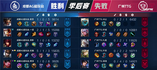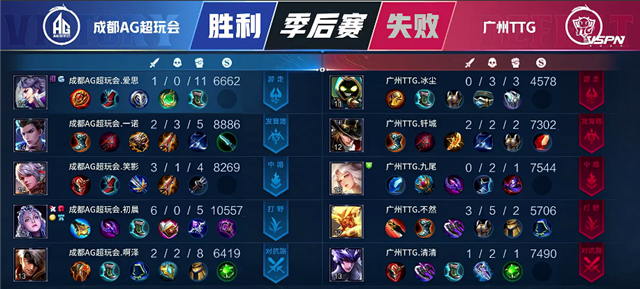 双方平稳开局。2分16秒百里玄策拿下暴君。5分18秒公孙离推掉下路一塔。5分25秒广州TTG推掉上路一塔。6分钟百里玄策拿下主宰。6分30秒广州TTG推掉下路一塔。6分35秒成都AG超玩会强攻中路一塔,公孙离拿下一血,成都AG超玩会推掉中路一塔。7分35秒百里玄策拿下暴君。9分28秒嬴政被击杀。10分钟成都AG超玩会推掉中路二塔。10分38秒百里玄策拿下暴君。11分25秒广州TTG推掉上路二塔。12分25秒百里玄策推掉上路二塔。12分40秒百里玄策拿下主宰。12分50秒百里玄策被击杀,成都AG超玩会推掉下路高地塔。14分55秒百里玄策拿下暴君。15分40秒成都AG超玩会强攻上路高地塔,团战成都AG超玩会打出1换2。17分钟野区团战,双方1换1。17分40秒成都AG超玩会拿下主宰。18分25秒公孙离推掉上路高地塔。19分25秒公孙离拿下暴君。19分40秒公孙离被击杀。20分24秒裴擒虎拿下风暴龙王。21分钟广州TTG推掉中路一塔。21分40秒广州TTG强攻上路高地塔,团战团灭成都AG超玩会,裴擒虎拿下双杀。21分56秒广州TTG点掉水晶再拿一分。