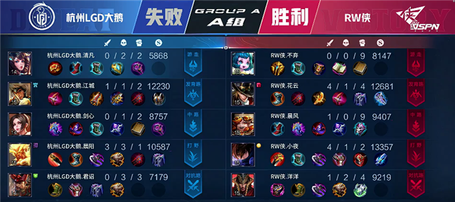 1分50秒杭州LGD大鹅强攻上路一塔,盘古拿下一血。2分10秒盘古拿下主宰。3分15秒中路交火,盘古被击杀。3分51秒澜拿下暴君。4分40秒成吉思汗推掉下路一塔。5分10秒野区团战,双方1换1。6分45秒RW侠强攻中路一塔,廉颇被击杀。7分钟成吉思汗推掉下路二塔,RW侠推掉中路二塔。8分20秒澜拿下暴君。8分40秒马可波罗推掉下路一塔。10分40秒澜拿下暴君。12分40秒中路团战,廉颇被击杀。13分40秒澜拿下主宰。15分20秒高地团战,RW侠团灭杭州LGD大鹅。15分40秒RW侠推掉水晶拿下本场比赛胜利。