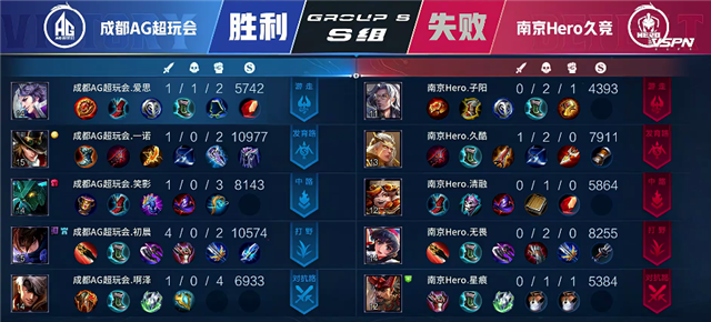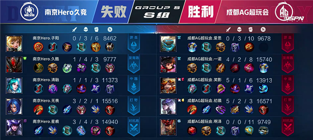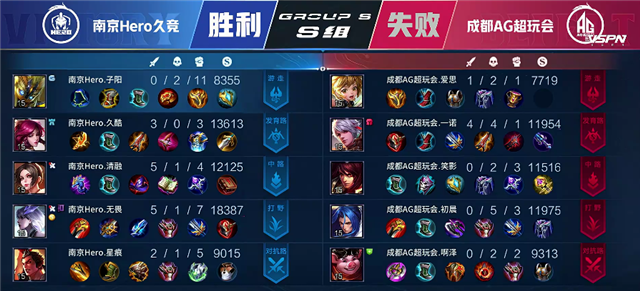 双方平稳开局。2分30秒娜可露露拿下暴君。4分10秒下河道团战,澜拿下一血,团战成都AG超玩会打出0换2。4分50秒马可波罗推掉下路一塔。5分30秒澜拿下主宰。7分07秒澜拿下暴君。7分45秒成都AG超玩会强攻上路一塔,团战成都AG超玩会打出1换2。8分30秒野区团战,成都AG超玩会打出0换2,成都AG超玩会顺势推掉中路一塔和二塔。9分30秒成都AG超玩会推掉下路二塔。10分30秒澜拿下暴君。11分钟澜拿下主宰。11分50秒成都AG超玩会强攻上路高地塔,南京Hero久竞上路高地塔被破。12分30秒成都AG超玩会强攻水晶。12分46秒成都AG超玩会点掉水晶率先拿下一分。
