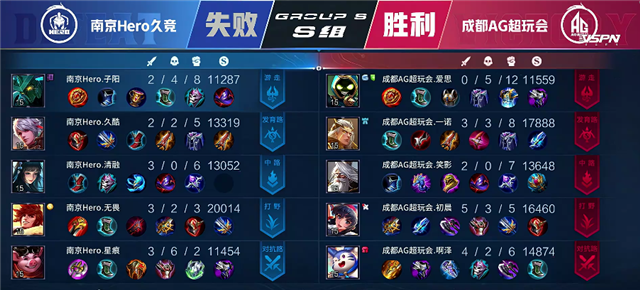 双方和平开局。2分17秒镜拿下主宰。2分30秒下野区团战,双方打出1换1,李元芳拿下一血。4分10秒镜拿下暴君。6分15秒下路团战,成都AG超玩会打出1换2。6分50秒镜拿下主宰。7分钟南京Hero久竞下路一塔被破。8分30秒白起被击杀。8分50秒镜拿下暴君。9分50秒中路团战,白起被击杀。10分20秒镜拿下暴君。10分40秒李元芳推掉中路一塔。11分20秒南京Hero久竞上路二塔被破,成都AG超玩会下路一塔被破。12分钟野区团战,成都AG超玩会打出0换2。12分25秒成都AG超玩会推掉中路二塔和下路二塔。13分钟镜拿下主宰。14分钟镜被橘右京蹲草单杀,随后团战成都AG超玩会打出2换3。16分26秒盾山推掉上路高地塔。17分06秒镜拿下主宰。17分47秒野区团战,盾山被击杀。19分50秒野区团战,成都AG超玩会打出2换3。成都AG超玩会顺势中路进攻高地,推掉中路高地塔后直逼水晶。20分43秒成都AG超玩攻破水晶率先拿下赛点。