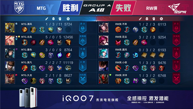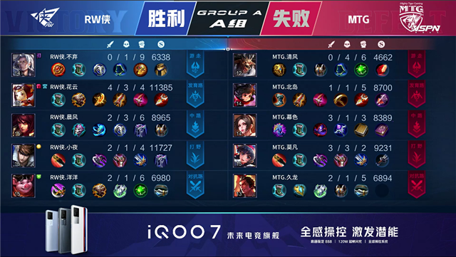 55秒,MTG太乙真人击杀沈梦溪拿下一血。2分16秒,MTG拿下先知主宰。2分37秒,RW侠拿下暴君。4分32秒,MTG破掉RW侠下一塔。5分35秒,中路团,双方1换1。6分06秒,RW侠中路击杀猪八戒。6分55秒,MTG控下暴君。7分32秒,MTG上路击杀公孙离。9分05秒,MTG上路击杀廉颇,随后破掉RW侠上二塔。10分24秒,MTG拿下暗影暴君。10分42秒,MTG破掉RW侠下二塔。12分04秒,RW侠击杀越塔的猪八戒。13分03秒,MTG破掉RW侠中一塔。13分40秒,MTG拿下暗影主宰,随后团战RW侠击杀狄仁杰并破掉MTG中一塔。14分45秒,野区团,RW侠打出0换2,随后控下暗影暴君。16分04秒,RW侠破掉MTG中二塔。18分45秒,RW侠控下暗影主宰。20分钟,下路团,RW侠打出2换5团灭对手。20分45秒,RW侠下路平推摧毁MTG水晶赢下比赛!