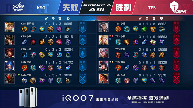 双方常规开局。1分10秒TES拿到中路河道之灵。2分25秒下路团战双方1换1,KSG拿到一血。2分56秒KSG野区击杀兰陵王。5分01秒TES那笑暴君。5分24秒下路团战TES打出1换3。6分13秒TES拿下主宰。9分12秒野区团战TES打出2换4。13分整TES拿下暗影主宰。13分37秒双方中路1换1。14分54秒KSG中路击杀周瑜。15分25秒中路团战双方2换2。17分33秒中路团战KSG打出0换2。17分42秒KSG摧毁敌方中路外、二塔。18分11秒KSG摧毁敌方中路高地塔。18分21秒中路团战KSG打出0换2。19分06秒KSG团灭对手拿下比赛。