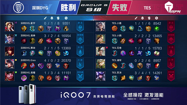 46秒,下河道团,深圳DYG打出0换3,廉颇拿下双杀。2分31秒,TES沈梦溪击杀孙膑。5分10秒,下路团,双方1换1。6分13秒,深圳DYG破掉TES下一塔。6分59秒,上路团,深圳DYG打出0换2。7分15秒,深圳DYG破掉TES中一塔。9分26秒,深圳DYG百里守约击杀沈梦溪,随后破掉TES上二塔。9分50秒,深圳DYG百里守约击杀娜可露露,随后破掉TES中二塔。11分05秒, 双方上路1换1。11分24秒,深圳DYG拿下暗影主宰。12分20秒,深圳DYG破掉TES下二塔。12分49秒,深圳DYG连续破掉TES中、上高地。13分30秒,深圳DYG下路包抄击杀娜可露露,随后控下暗影暴君。14分12秒,深圳DYG高地团战团灭对手,随后一波摧毁TES水晶赢下比赛。