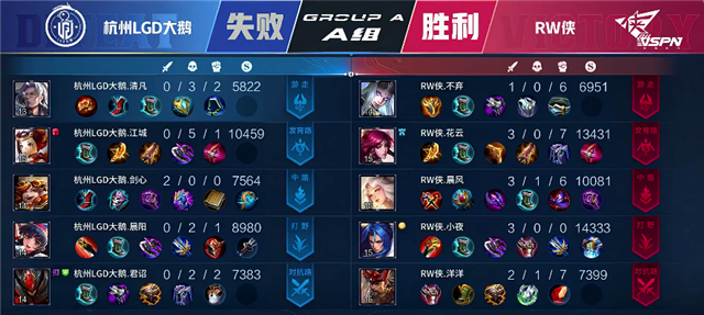 RW侠开局入侵野区没能拿到野区资源。2分20秒RW侠拿下主宰,杭州LGD大鹅拿下暴君。3分钟RW侠强攻下路一塔,嫦娥拿下一血和双杀。3分27秒伽罗推掉下路一塔。5分25秒伽罗推掉上路一塔。5分40秒杭州LGD大鹅中路一塔被破。7分钟中路团战,RW侠打出0换2。8分05秒嫦娥拿下主宰。9分钟RW侠中路越塔强攻,团战RW侠打出0换2。9分40秒杭州LGD大鹅中路二塔被破。10分10秒RW侠拿下暴君。10分58秒橘右京拿下主宰。11分40秒中路团战,RW侠打出1换2,RW侠推掉中路高地塔。14分06秒RW侠推掉下路高地塔。14分44秒RW侠拿下暴君。15分钟RW侠强攻高地,伽罗拿下双杀。15分18秒RW侠攻破水晶率先拿下赛点。