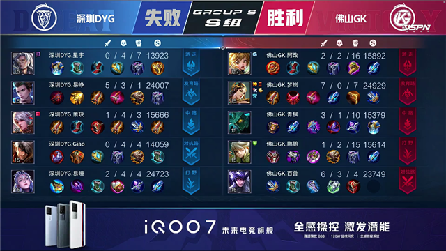 1分27秒深圳DYG不知火舞单杀关羽拿下一血,双方1换1,2分55秒深圳DYG拿下第一条把暴君。5分20秒团战佛山GK打出0换4,拆掉深圳DYG中路一塔,6分钟深圳DYG边路外塔被破。7分15秒深圳DYG张飞被击杀,9分26秒佛山GK澜击杀不知火舞,拆掉深圳DYG中路二塔。10分24秒深圳DYG拿下暗影主宰,10分42秒佛山GK拆掉深圳DYG中路高地。11分20秒佛山GK拿下暗影暴君,12分23秒深圳DYG下路二塔被破,13分30秒佛山GK拆掉深圳DYG上路高地,澜拿下三杀佛山GK打出2换3,14分10秒佛山GK团灭深圳DYG,一波拆掉水晶。