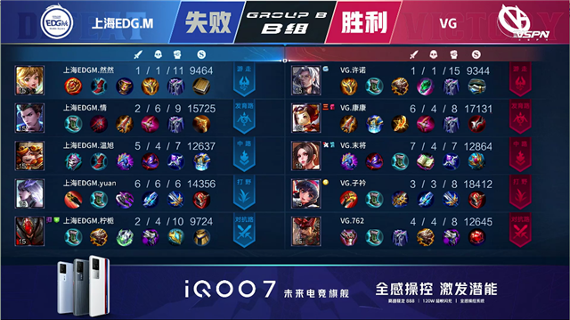 57秒,VG沈梦溪击杀刘邦拿下一血。2分11秒,VG拿下暴君。3分30秒,VG沈梦溪中路单杀不知火舞。4分24秒,上海EDG.M拿下先知主宰。4分42秒,上海EDG.M吕布上路击杀澜。5分49秒,上海EDG.M破掉VG上一塔。6分13秒,下路团,VG塔下反打打出1换3,随后破掉上海EDG.M下一塔。7分13秒,双方团战1换1。8分44秒,上海EDG.M偷掉先知主宰。8分58秒,VG中路击杀赵云。10分25秒,VG澜抢到暗影主宰。11分47秒,VG澜大招推回刘邦配合队友将其击杀。12分30秒,VG拿下暗影暴君。12分59秒,VG澜中路单杀不知火舞,随后队伍破掉上海EDG.M上二塔。13分25秒,VG团战打出0换2。13分45秒,高地团,双方1换1,但VG破掉上海EDG.M中、上两座高地。14分51秒,中路团,VG打出0换5团灭对手。15分10秒,VG一波摧毁上海EDG.M水晶先下一城。