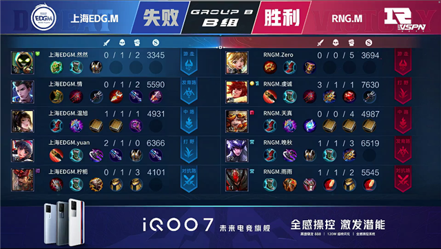双方平稳开局,2分30秒娜可露露击杀马超拿下一血,上海EDG.M打出0换2。3分39秒上海EDG.M娜可露露独自拿下先知主宰。6分31秒RNG.M拿下暴君,马超于上路拆掉上海EDG.M上路一塔,8分钟上海EDG.M下路一塔被破。8分40秒野区团战RNG.M打出1换4一波拆掉上海EDG.M上路二塔和高地,9分钟RNG.M击杀狄仁杰团灭上海EDG.M,9分09秒RNG.M一波拆掉上海EDG.M水晶,拿下本场比赛胜利!