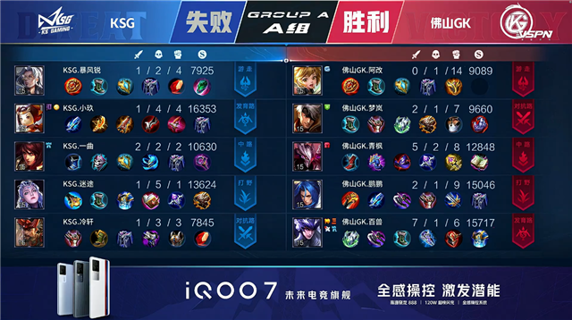 开局59秒佛山GK反掉敌方蓝BUFF。4分39秒KSG中路击杀大乔拿到一血,KSG后续追击打出1换3。6分04秒KSG下路击杀虞姬。8分25秒佛山GK上路击杀橘右京。9分07秒佛山GK摧毁敌方下路外塔。10分30秒中路团战KSG击杀虞姬。10分54秒KSG拿下暗影暴君。12分03秒KSG下路打出0换3。12分49秒KSG拿下暗影主宰。15分09秒KSG拿下暗影暴君。16分33秒上路团战KSG打出1换3。16分53秒KSG摧毁敌方中路高地塔。17分02秒KSG摧毁敌方水晶拿下比赛。