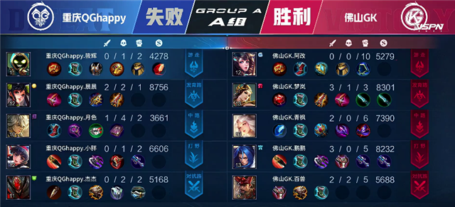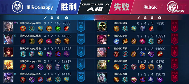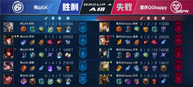 开局双方射手走中抢线。廉颇拿下中路1分钟河道之灵。2分钟上路越塔强攻,不知火舞拿到一血。2分30秒重庆QG拿下暴君。4分10秒芈月拿下主宰。4分45秒重庆QG强推下路一塔。5分46秒在上路澜单杀芈月。6分钟中路团战,吕布被击杀。6分20秒佛山GK推掉下路一塔,团战打出1换2。7分钟芈月拿下暴君。7分35秒重庆QG推掉上路一塔,同时吕布被击杀。8分15秒佛山GK强攻中路一塔,元歌被击杀。8分19秒重庆QG推掉下路二塔。9分44秒上路团战,佛山GK打出1换4,不知火舞拿下双杀。10分44秒佛山GK拿下暴君。12分钟佛山GK拿下主宰。14分24秒上路团战,重庆QG被打出团灭,狄仁杰拿下三杀,不知火舞拿下双杀。16分26秒重庆QG中路高地塔被破。17分20秒大乔被击杀。18分钟重庆QG中路高地塔被破,佛山GK强攻水晶,澜拿下双杀。18分30秒佛山GK攻破水晶扳回一局。
