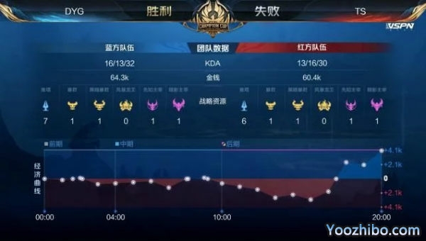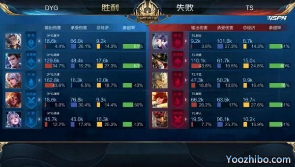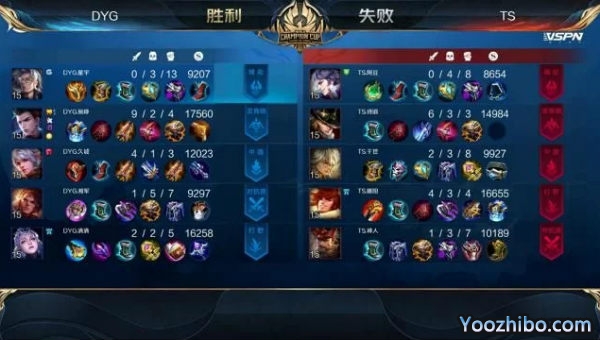 第三局,失利就要被DYG拿到赛点的TS放手一搏,暖阳裴擒虎前中期节奏出色,TS很快拿到经济优势,而DYG则在陷入劣势后选择避战;比赛进入后期,DYG拖时间的目的达到,久诚百里守约装备成型,DYG形成反压制,久诚百发百中的百里守约完全压制了TS,DYG不断向前推进,反超经济;最后一波团战,DYG压迫TS高地,久诚远程火力支撑,DYG打出1换4,推掉TS水晶,3-0拿到赛点。