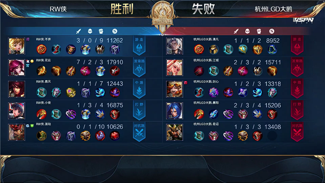 双方平稳开局,2分15秒杭州LGD大鹅拿下暴君,RW侠拿下先知主宰。3分51秒杭州LGD大鹅沈梦溪击杀廉颇拿下一血,杭州LGD大鹅打出0换2。5分36秒杭州LGD大鹅击杀伽罗,7分42秒上路团杭州LGD大鹅拆掉RW侠上路一塔,RW侠击杀橘右京。10分50秒杭州LGD大鹅拿下暗影暴君,12分56秒杭州LGD大鹅拿下暗影主宰,14分钟杭州LGD大鹅拆掉RW侠中路一塔。15分10秒中路团杭州LGD大鹅击杀周瑜,15分32秒杭州LGD大鹅拿下暗影暴君。16分41秒杭州LGD大鹅击杀娜可露露,拆掉RW侠上路二塔。18分钟RW侠击杀公孙离,杭州LGD大鹅拆掉RW侠下路高地。20分钟上路团战RW侠打出1换4,21分34秒RW侠抢下风暴龙王,打出1换2。22分钟RW侠拆掉杭州LGD大鹅中路高地,23分20秒团战RW侠打出0换3,一波拆掉水晶拿下胜利!