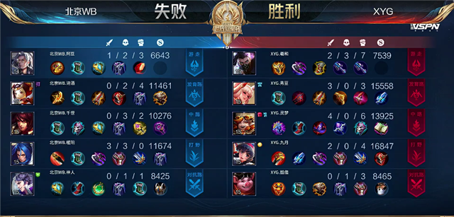 30秒中路交火,兰陵王拿下一血。2分钟下路团战,橘右京被击杀。2分25秒娜可露露拿下暴君。2分50秒XYG入侵野区,橘右京被击杀。3分30秒周瑜被击杀。4分05秒娜可露露拿下主宰。4分15秒XYG下路越塔,鲁班七号被击杀。5分10秒XYG入侵野区,猪八戒被击杀。5分25秒北京WB下路一塔被破。9分钟XYG进攻上路二塔,兰陵王被击杀。10分15秒娜可露露拿下暴君。11分20兰陵王被击杀,XYG推掉下路二塔。11分33秒公孙离推掉中路一塔。11分50秒娜可露露拿下主宰。13分40秒XYG推掉中路二塔。17分56秒公孙离推掉下路高地塔。18分30秒野区团战,XYG打出1换4。XYG顺势上路一波直上高地,19分26秒XYG破掉水晶拿下本场比赛胜利。