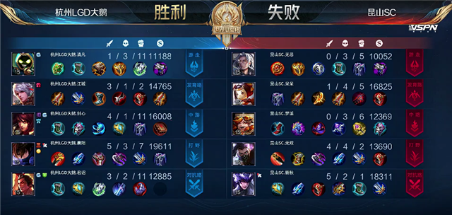 开局上路交火,48秒吕布拿下一血。2分20秒兰陵王拿下暴君。4分40秒上路团战,澜被击杀。5分25秒马超推掉上路一塔。5分45秒中路团战,鲁班大师被击杀。6分10秒杭州LGD大鹅下路一塔被破。6分30秒昆山SC入侵野区,兰陵王被击杀。7分20秒沈梦溪抢下暴君。8分40秒澜拿下主宰。10分10秒中路团战,鲁班七号被击杀。11分钟澜拿下暴君。12分25秒昆山SC下路二塔被破。13分20秒澜拿下主宰。14分10秒中路团战,杭州LGD大鹅打出3换4,马超拿下双杀,澜拿下三杀。杭州LGD大鹅顺势推掉下路高地塔。15分44秒澜拿下暴君。16分55秒昆山SC中路高地塔被破。18分20秒澜拿下主宰。19分30秒中路团战,杭州LGD大鹅打出1换2。22分10秒野区团战,杭州LGD大鹅打出1换2。24分10秒上路团战,杭州LGD大鹅1换2。杭州LGD大鹅顺势上路一波直上高地。25分20秒杭州LGD大鹅推掉水晶拿下本场比赛胜利。