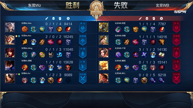 双方和平开局。1分10秒东莞Wz入侵野区,不知火舞拿下一血,团战北京WB打出0换2。2分30秒澜拿下暴君。5分40秒黄忠推掉下路一塔。5分50秒盘古推掉上路一塔。6分30秒盘古拿下暴君。8分13秒盘古拿下主宰。11分钟澜抢下暴君,团战双方1换1。12分钟北京WB入侵野区,鲁班大师被击杀。13分30秒盘古拿下主宰。14分40秒北京WB推掉下路二塔,夏侯惇被击杀。15分18秒盘古拿下暴君。15分36秒北京WB推掉中路一塔。18分13秒盘古拿下主宰。19分30秒北京WB推掉下路高地塔。21分钟上路团战,东莞Wz打出0换3。东莞Wz顺势上路一波直上高地。22分钟东莞Wz推掉水晶拿下本场比赛胜利。