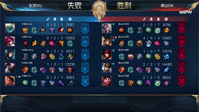 1分49秒,上路团,东莞Wz兰陵王击杀赵云拿下一血。2分20秒,东莞Wz拿下暴君。3分12秒,佛山GK抱团击杀西施。4分22秒,佛山GK赵云配合猪八戒抓死吕布,随后破掉东莞Wz上一塔。5分19秒,佛山GK下路击杀伽罗。9分05秒,佛山GK击杀兰陵王。9分37秒,佛山GK破掉东莞Wz上二塔。10分16秒,佛山GK拿下暗影主宰,随后东莞Wz拿下暗影暴君,但佛山GK赶到击杀盾山。11分04秒,佛山GK破掉东莞Wz下二塔,随后转线破掉东莞Wz中一塔。12分58秒,东莞Wz击杀被西施拉脱节的猪八戒。14分58秒,佛山GK拿下暗影主宰。15分44秒,佛山GK控下暗影暴君。18分14秒,佛山GK上路击杀兰陵王。18分40秒,佛山GK打出2换4,随后破掉东莞Wz中二塔及上高地。19分22秒,佛山GK破掉东莞Wz中高地,击杀吕布团灭对手后摧毁东莞Wz水晶。