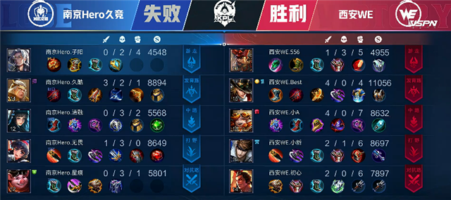 开局西安WE入侵野区,镜拿下红buff。1分59秒西安WE强攻上路一塔,镜拿下一血,双方打出1换1。3分50秒西安WE在下路集火击杀张飞。4分15秒上路团战,阿古朵被击杀。4分35秒西安WE推掉下路一塔。5分10秒关羽在上河道被击杀。5分30秒阿古朵拿下主宰。6分41秒马超在上河道被击杀。7分15秒镜拿下暴君。8分50秒西安WE推掉上路二塔。11分钟镜拿下暴君。13分钟上路团战,南京Hero久竞打出0换2。13分39秒南京Hero久竞拿下主宰。15分50秒南京Hero久竞强攻中路一塔,双方打出1换1。17分钟下路团战,西安WE打出0换2。17分10秒南京Hero久竞推掉中路二塔。18分12秒镜拿下主宰。18分38秒西安WE推掉中路一塔。21分钟南京Hero久竞推掉上路二塔。21分40秒中路上河道团战,西安WE打出0换2。22分44秒镜拿下风暴龙王。23分55秒西安WE推掉上路高地塔。29分20秒镜拿下风暴龙王,团战关羽被击杀。30分48秒西安WE推掉下路高地塔。32分10秒西安WE强冲中路高地塔,蒙犽被击杀。33分40秒中路团战,南京Hero久竞打出0换0。34分15秒南京Hero久竞推掉中路高地塔,团战双方打出1换1。35分20秒镜拿下风暴龙王。35分55秒西安WE强推中路高地塔。36分41秒西安WE攻破水晶扳回一局。