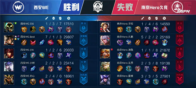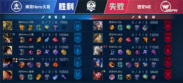 开局西安WE中路和下路换线。2分钟中路下河道团战,南京Hero久竞打出0换2,澜拿下双杀。2分30秒澜拿下暴君。4分15秒澜拿下主宰。5分16秒马可波罗推掉下路一塔。5分50秒上野区团战,南京Hero久竞打出1换2。6分55秒澜拿下暴君。7分25秒南京Hero久竞推掉上路一塔。9分45秒西安WE推掉下路一塔。10分10秒南京Hero久竞强攻上路二塔,澜拿下双杀。10分30秒南京Hero久竞推掉中路一塔。11分钟澜拿下暴君。11分50秒马可波罗推掉下路二塔。12分20秒西安WE中路二塔被破。13分钟南京Hero久竞拿下主宰。15分50秒南京Hero久竞拿下暴君。17分21秒南京Hero久竞拿下主宰。18分30秒南京Hero久竞强攻下路高地塔,虞姬被击杀。18分42秒南京Hero久竞推掉中路高地塔。19分钟,南京Hero久竞强攻水晶率先拿下一局。