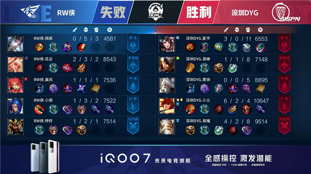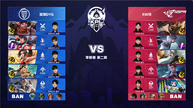 双方平稳开局,2分21秒深圳DYG拿下主宰。3分13秒RW侠拿下暴君,深圳DYG摧毁敌方上路外塔。3分33秒RW侠狭路击杀老夫子拿到一血。4分57秒深圳DYG下路打出0换2。5分08秒RW侠摧毁敌方中路外塔。5分58秒中路团战深圳DYG打出0换2。7分34秒深圳DYG野区打出0换2。7分44秒深圳DYG摧毁敌方下路二塔并击杀公孙离。9分16秒RW侠上路击杀裴擒虎,深圳DYG摧毁敌方下路高地塔并在野区击杀橘右京。11分23秒主宰处团战深圳DYG击杀东皇太一。12分12秒中路团战深圳DYG打出0换4。12分36秒深圳DYG摧毁敌方水晶拿下比赛。