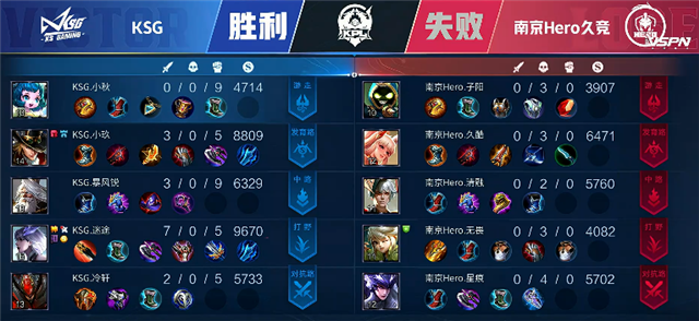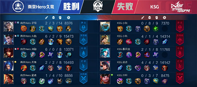 开局狄仁杰中路抢线,橘右京入侵蓝区,王昭君拿下一血,双方打出1换1。2分10秒,盾山在下河道被击杀。2分26秒南京Hero久竞拿下暴君。4分20秒中路团战,KSG打出1换2。5分钟KSG上路一塔被破。6分40秒南京Hero久竞拿下暴君。7分钟中路下河道猪八戒被击杀。7分10秒KSG中路一塔被推。8分10秒中路团战,双方打出1换1。9分10秒上野区团战,狄仁杰被击杀。10分25秒南京Hero久竞拿下暴君。11分10秒上野区团战,双方1换1。12分20秒上野区再次团战,双方1换1。12分45秒,KSG中路二塔被破。14分26秒中路上河道团战,盾山被击杀。15分15秒南京Hero久竞拿下暴君。17分10秒中路二塔处团战,南京Hero久竞打出1换2。18分57秒,橘右京拿下主宰。19分26秒双方下野区团战,南京Hero久竞打出2换5。20分15秒,南京Hero久竞推掉水晶拿下本局比赛。