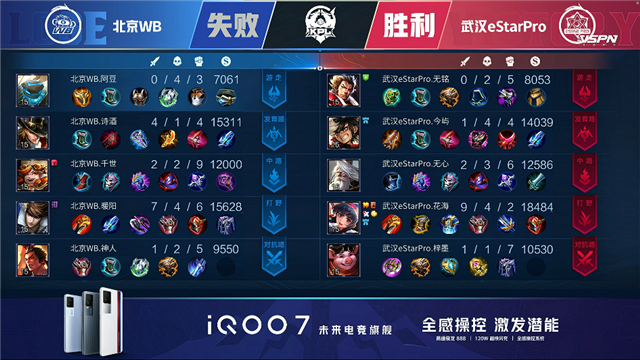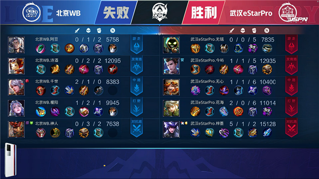 1分13秒武汉eStar抢下中路河道之灵,2分21秒武汉eStar拿下第一条暴君。3分29秒北京WB露娜击杀马超拿下一血,4分15秒上路团武汉eStar打出1换2,4分41秒武汉eStar拆掉北京WB上路一塔。6分54秒武汉eStar拿下暴君,7分钟武汉eStar拆掉北京WB下了一塔。7分30秒武汉eStar击杀鲁班七号,拆掉北京WB下了二塔。9分38秒武汉eStar拆掉北京WB上路二塔,中路马超击杀百里守约,10分02秒北京WB露娜被击杀。10分23秒武汉eStar拆掉北京WB中路一塔,10分40秒武汉eStar拿下暗影暴君。11分33秒北京WB三路二塔被破,12分54秒武汉eStar拿下暗影主宰。13分40秒武汉eStar拆掉北京WB下路高地,双方1换1,15分40秒武汉eStar拆掉北京WB上路高地,打出1换2。16分19秒武汉eStar拆掉北京WB中路高地,带领兵线强拆睡水晶拿下本局胜利。