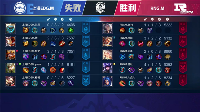 44秒,上海EDG.M马可波罗击杀蔡文姬拿下一血。2分20秒,RNG.M拿下暴君。2分26秒,野区团,RNG.M打出0换2并反掉蓝buff。4分30秒,RNG.M后羿河道击杀太乙真人。5分50秒,上海EDG.M拿下先知主宰。8分钟,RNG.M破掉上海EDG.M上一塔。10分17秒,下路团,上海EDG.M打出0换3。10分57秒,上海EDG.M拿下黑暗暴君。11分50秒,RNG.M击杀姜子牙。12分17秒,双方中路1换1。12分56秒,RNG.M控下主宰。14分01秒,RNG.M打出0换4,镜进场收割拿下四杀。14分22秒,RNG.M一波摧毁上海EDG.M水晶扳回一城。