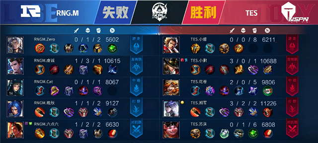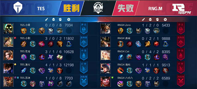 双方平稳开局。1分24秒,中路上河道廉颇拿到一血。2分16秒,澜拿到主宰。3分30秒,RNG.M拿下暴君。5分39秒虞姬推掉下路一塔,5分49秒RNG.M推掉上路一塔。7分50秒TES暴君逼团,打出0换3。8分26秒,TES推掉中路一塔。10分35秒,澜拿下暴君。10分44秒中路二塔处团战,牛魔被击杀。11分57秒,RNG.M上路2塔处爆发团战,双方打出2换2,TES顺势推掉上路二塔和高地塔。13分40秒TES主宰逼团,牛魔被击杀。14分25秒中路高地塔旁野区爆发团战,TES击杀二人顺势推掉中路高地塔直逼水晶,TES率先拿下一局。
