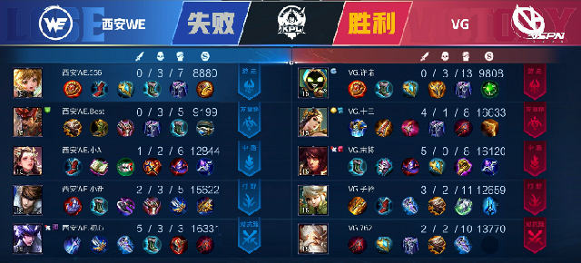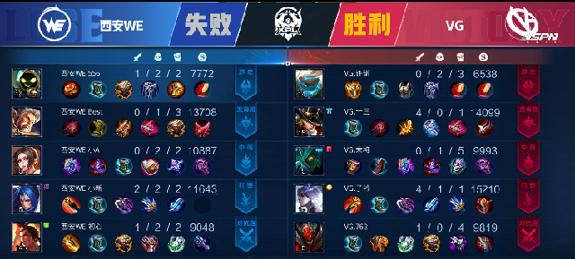 双方正常开局。1分钟,赵云拿下中路河道之灵。2分18秒,赵云拿下暴君。3分40秒,中路下河道爆发团战,双方1换1。4分13秒,中路下河道马超被击杀。5分16秒,VG推掉西安WE上路一塔。6分11秒虞姬在上路被击杀,双方互换边路一塔,同时VG推掉下路二塔。7分06秒,赵云拿下暴君。8分20秒VG强行越中路一塔爆发团战,西安WE打出0换2。10分18秒,VG推掉中路一塔。10分35秒西安WE集火下路762爆发团战,VG打出0换1。11分41秒,VG拿下黑暗暴君。13分16秒VG推掉中路二塔。14分10秒,中路爆发团战,VG打出0换2。15分钟,VG拿下主宰。16分20秒中路下野区爆发团战,双方打出0换2。17分53秒,中路下河道爆发团战,VG打出2换3。19分30秒VG再次拿下暴君。20分08秒,VG推掉中路高地塔,20分33秒顺势推掉上路高地塔。21分钟VG暴君逼团打出0换3,顺势上高地强推水晶。21分24秒,VG攻破水晶拿下本局比赛。