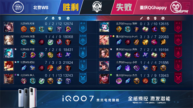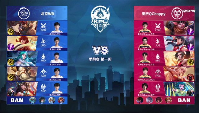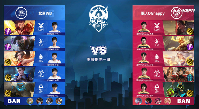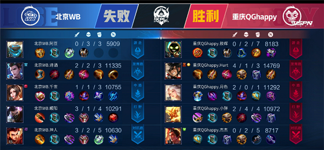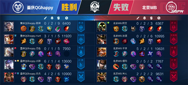 开局重庆QGhappy猪八戒换线到中路。1分51秒下路一塔团战,不知火舞拿下一血,2分钟重庆QGhappy拿下暴君。2分47秒廉颇入侵蓝区被王昭君击杀。4分30秒下路爆发团战,北京WB打出0换3并顺势推掉下路一塔。6分24秒北京WB主宰逼团,蔡文姬被击杀。6分40秒上路一塔北京WB越塔爆发团战打出1换1,重庆QGhappy顺势推下北京WB中一塔和上一塔。7分40秒重庆QGhappy拿下主宰。10分钟重庆QGhappy拿下暴君。11分20秒大乔老夫子带线偷掉下路二塔。11分55秒北京WB下路二塔爆发团战,重庆QGhappy打出1换2。13分钟娜可露露拿下主宰。16分10秒重庆QG上路逼团击杀王昭君并推掉二塔。17分40秒北京WB推掉中一塔。18分27秒在上路野区小胖被暖阳击杀。20分钟28秒大乔老夫子偷掉上路一塔。21分39秒北京WB风暴龙王逼团,重庆QGhappy打出0换3,22分23秒重庆QGhappy强推高地公孙离被击杀。23分17秒北京WB拿下风暴龙王。23分48秒北京WB推掉下路高地塔。24分40秒北京WB上路逼团老夫子被击杀,25分钟重庆QGhappy中路高地塔被破。27分40秒中路下河道草爆发团战重庆QGhappy打出1换2。29分8秒中路下河道草再次团战,北京WB打出1换5。29分30秒北京WB推掉水晶拿下本局比赛。