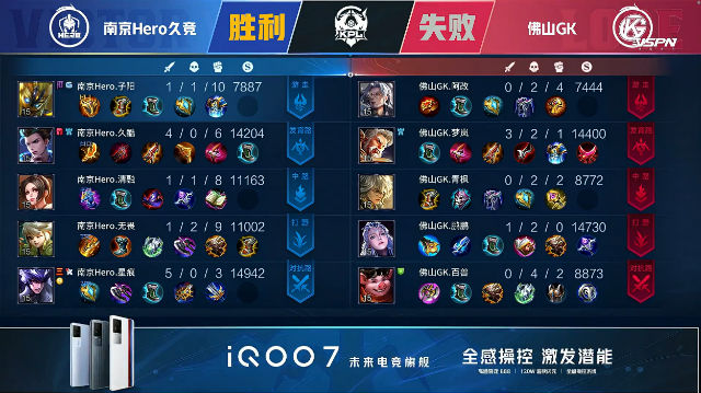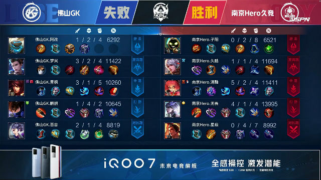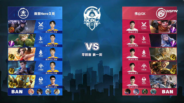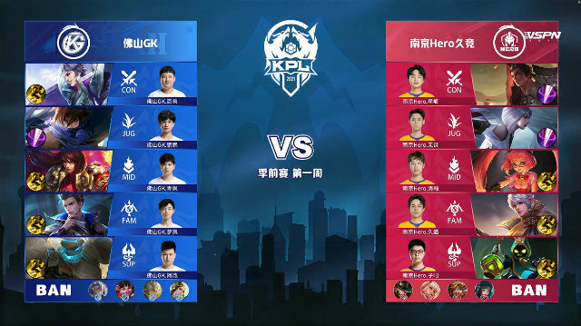 双方平稳开局,2分27秒佛山GK拿下暴君。2分46秒中路团战南京Hero击杀猪八戒拿到一血。3分38秒南京Hero马超上路单杀露娜,其他队友中路击杀张良与黄忠。5分40秒南京Hero摧毁敌方中路外塔,5分56秒佛山GK摧毁敌方下路外塔。6分15秒南京Hero拿下主宰。6分58秒南京Hero摧毁敌方上路外塔。7分11秒南京Hero拿下暴君。8分24秒佛山GK摧毁敌方上路外塔。9分49秒南京Hero摧毁敌方下路二塔。10分31秒南京Hero拿下暗影主宰。10分52秒南京Hero上路击杀猪八戒并摧毁上路二塔。11分08秒南京Hero摧毁敌方中路二塔。12分08秒南京Hero拿下暗影暴君。13分31秒中路团战南京Hero击杀猪八戒。13分57秒高地团战双方1换1,南京Hero摧毁敌方中路高地塔、下路高地塔。14分57秒佛山GK中路打出0换2,黄忠拿到二连击破。15分09秒佛山GK拿下暗影主宰。15分26秒佛山GK摧毁敌方中路外、二塔。16分35秒佛山GK中路击杀阿古朵。16分49秒佛山GK拿下暴君。17分15秒佛山GK摧毁敌方中路高地塔。17分29秒佛山GK摧毁敌方上路二塔。17分48秒佛山GK摧毁敌方上路高地塔。17分59秒南京Hero打出0换5,马超拿到三连决胜。18分44秒南京Hero摧毁敌方水晶拿下比赛。