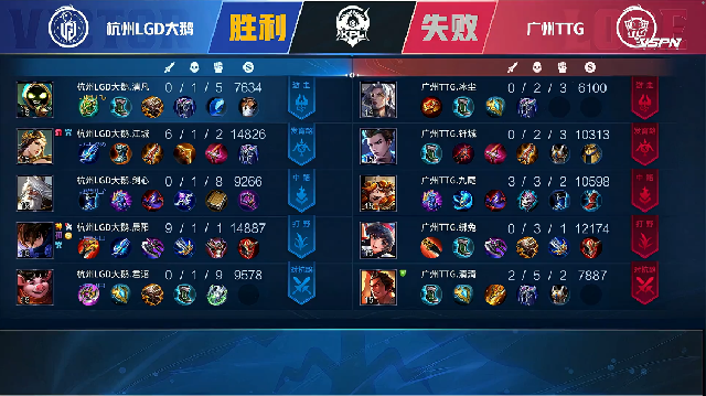 双方平稳开局,1分10秒杭州LGD大鹅中路击杀吕布拿到一血。1分57秒双上上路1换1。2分35秒广州TTG拿下暴君。2分50秒杭州LGD大鹅上路击杀吕布。5分18秒杭州LGD大鹅澜中路下河道一打三完成二连击破。5分52秒杭州LGD大鹅摧毁敌方下路外塔。6分07秒杭州LGD大鹅下路击杀沈梦溪。6分40秒杭州LGD大鹅摧毁敌方中路外塔。7分01秒广州TTG拿下暴君。7分12秒杭州LGD大鹅摧毁敌方上路外塔。7分46秒杭州LGD大鹅虞姬下路单杀娜可露露。8分05秒下路团战广州TTG打出0换2,8分34秒广州TTG中路击杀太乙真人。8分51秒广州TTG中路击杀姜子牙并摧毁中路外塔。9分15秒广州TTG摧毁敌方上路外塔。9分44秒广州TTG拿下主宰。10分35秒暴君处团战杭州LGD大鹅打出0换2,广州TTG拿到暗影暴君。11分09秒杭州LGD大鹅摧毁敌方中路二塔。12分01秒中路团战杭州LGD大鹅打出0换2。12分27秒杭州LGD大鹅摧毁敌方中路高地塔。13分18秒杭州LGD大鹅拿下暗影主宰。15分整杭州LGD大鹅拿下暗影暴君。15分51秒杭州LGD大鹅摧毁敌方上路二塔。16分08秒杭州LGD大鹅虞姬上路击杀娜可露露。16分24秒高地团战杭州LGD大鹅打出0换3并摧毁水晶。