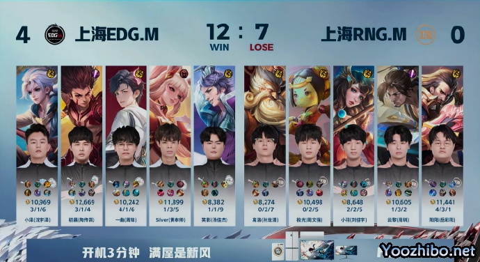 第三局:这局小泽的芈月带线牵制表现出色,在线上也对亚连形成了压制。后期百里守约的伤害起来后,夏侯惇在前方顶着伤害,输出环境良好。最后一波团战团灭了RNGM,EDGM直落三局来到赛点。本局MVP为上海EDGM小泽(沈宇泽)的芈月。