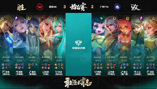 第五局,中一塔处幕色的弈星大招框到广州TTG多人,鹏鹏的露娜和百兽的狂铁进场,打出一波零换四的团战。高地处TTG打回一波,但鹏鹏的露娜再次跑掉。随后西安WE击杀清清的姬小满,顺着兵线一波拿下比赛。本局MVP为西安WE百兽的狂铁。