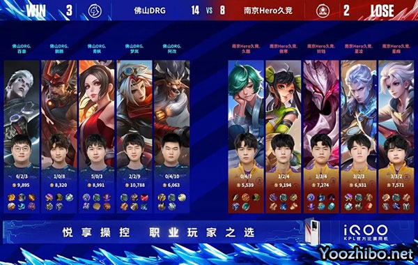 十五分钟傲寒戈娅黑砂爆弹瞬秒孙尚香,佛山DRG缺少输出主力退至高地,南京Hero久竞推掉上路高地塔。十八分半,南京Hero久竞带龙兵从下路冲上水晶,强点一波先拿赛点!