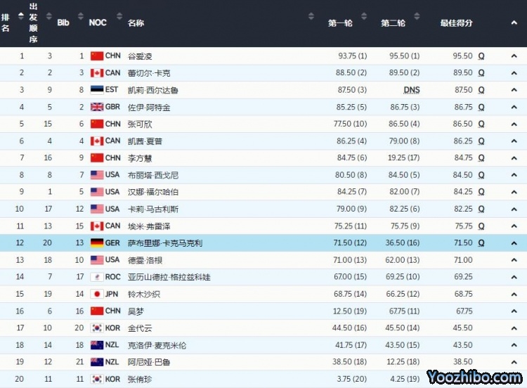 最终谷爱凌以95.50分的超高分获得第1名,张可欣86.50分排名第5位,李方慧84.75分排名第7的位置,这三位中国选手都获得了晋级决赛资格,而吴梦则以67.75分排名第16位,无缘进入决赛的争夺。